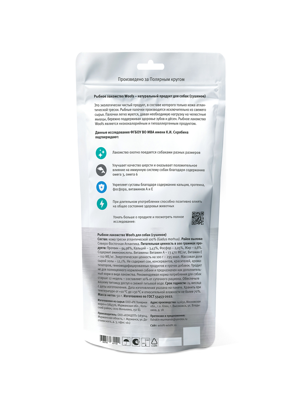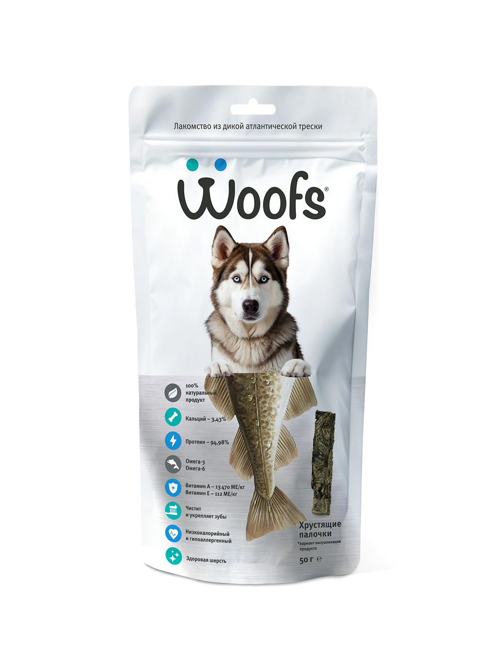 Натуральное лакомство для собак из трески Woofs, хрустящие палочки, 50 гр.